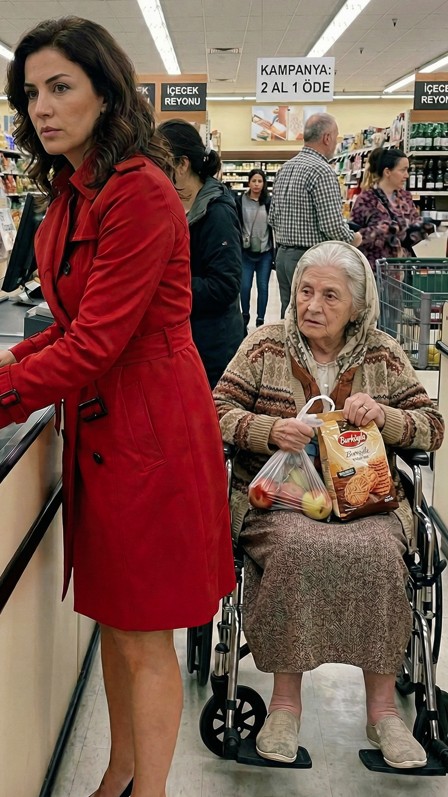 Tam o sırada, topukların tıkırtısı yaklaştı. Kırklı yaşlarında, kendinden emin ve kibirli bir kadın… Üzerinde pahalı bir trençkot, kolunda marka çanta. Arabası ithal havyar, özel üretim dana eti ve binlerce liralık şampanyalarla dolu. Sanki market değil de özel davet salonu.