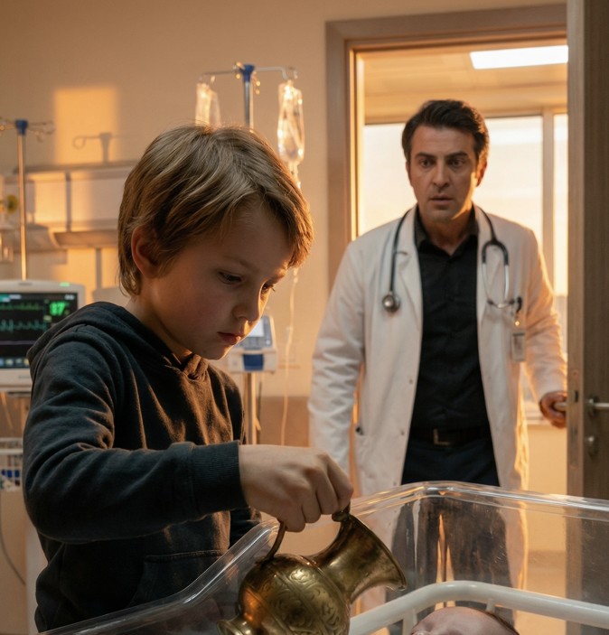 O hüzünlü sessizliğin ortasında, eski kıyafetler içinde bir evsiz çocuk, kimsenin nasıl girdiğini anlayamadığı bir şekilde yoğun bakım odasının kapısında belirdi. Güvenlik ve doktorların şaşkın bakışları arasında yavaşça bebeğin yatağına yaklaştı. Cebinden çıkardığı kadim, metal bir kadehin içindeki berrak sıvıyı bebeğin göğsüne dikkatlice döktü. O an odadaki herkes, mantığın ötesinde bir mucizenin eşiğinde olduklarını hissetti.